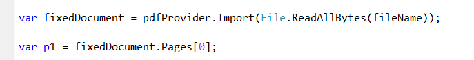 var fixedDocument = pdfProvider.Import(File.ReadAllBytes(@"..\..\lorem.pdf"));