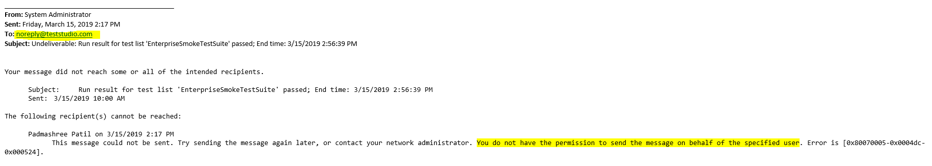 I tried with changing port to 456 and scheduling the Test List run. Now email is getting generated but failing send email. The error appears to be a permissions error that cannot send the email on my behalf.