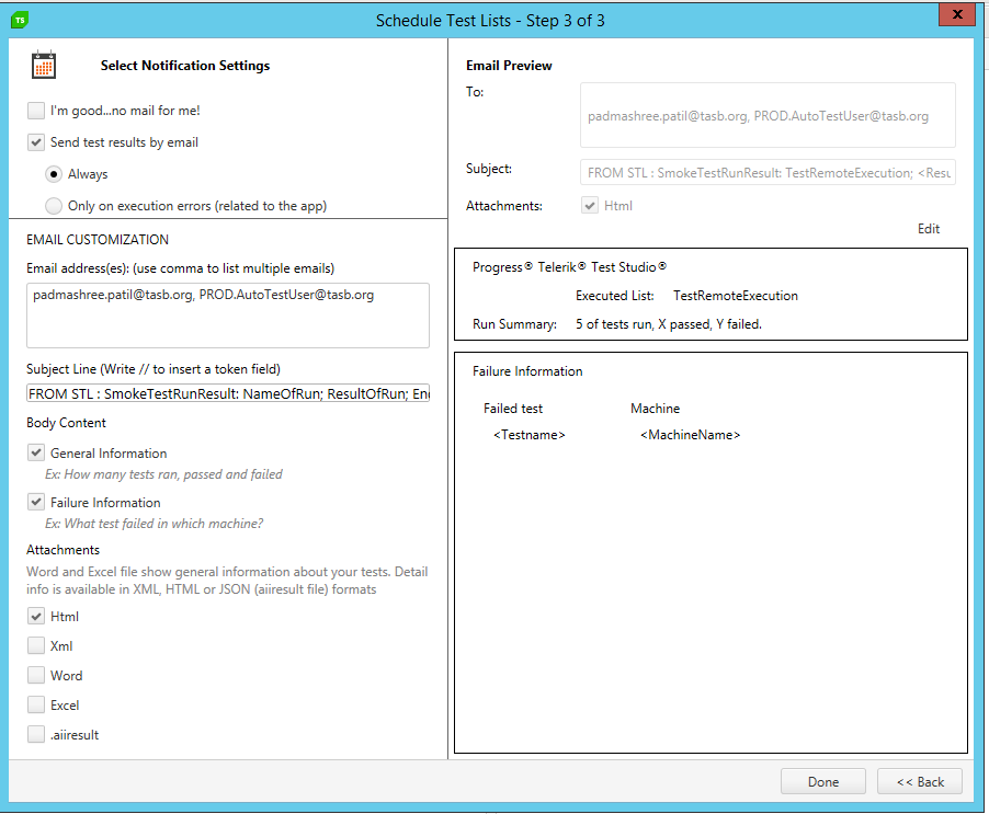 As a first step. there is something to sort out for the automatic email notifications - this setting is available out of the box when executing test lists through the scheduling service. The Scheduling command line runner, which mu colleague Daniel had suggested, will allow you to use the mentioned configuration and send emails with some additional adjustments (listed below). However, if you intend to use the local command line runner, which is called ArtOfTest.Runner.exe, this email configuration will not be available.