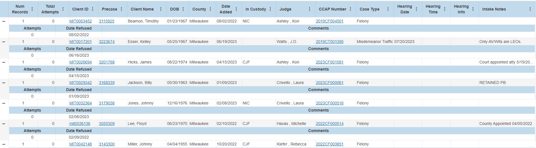 I then attempted adding a subreport inside the main table. This subreport links to a separate report containing the "attempts", "date refused", and "comments" table. However, I ran into some roadblocks with this as well. When the subreport is outside the table, it loads fine with all values showing. Unfortunately, when I move the subreport into the main table, I cannot get it to load properly. When I add the datasource to the subreport (same datasource as the main report), the subreport doesn't show at all. When I remove the datasource from the subreport, the headers of the sub table show, but no data loads. Is there a reason the subreport wont load properly inside the table?