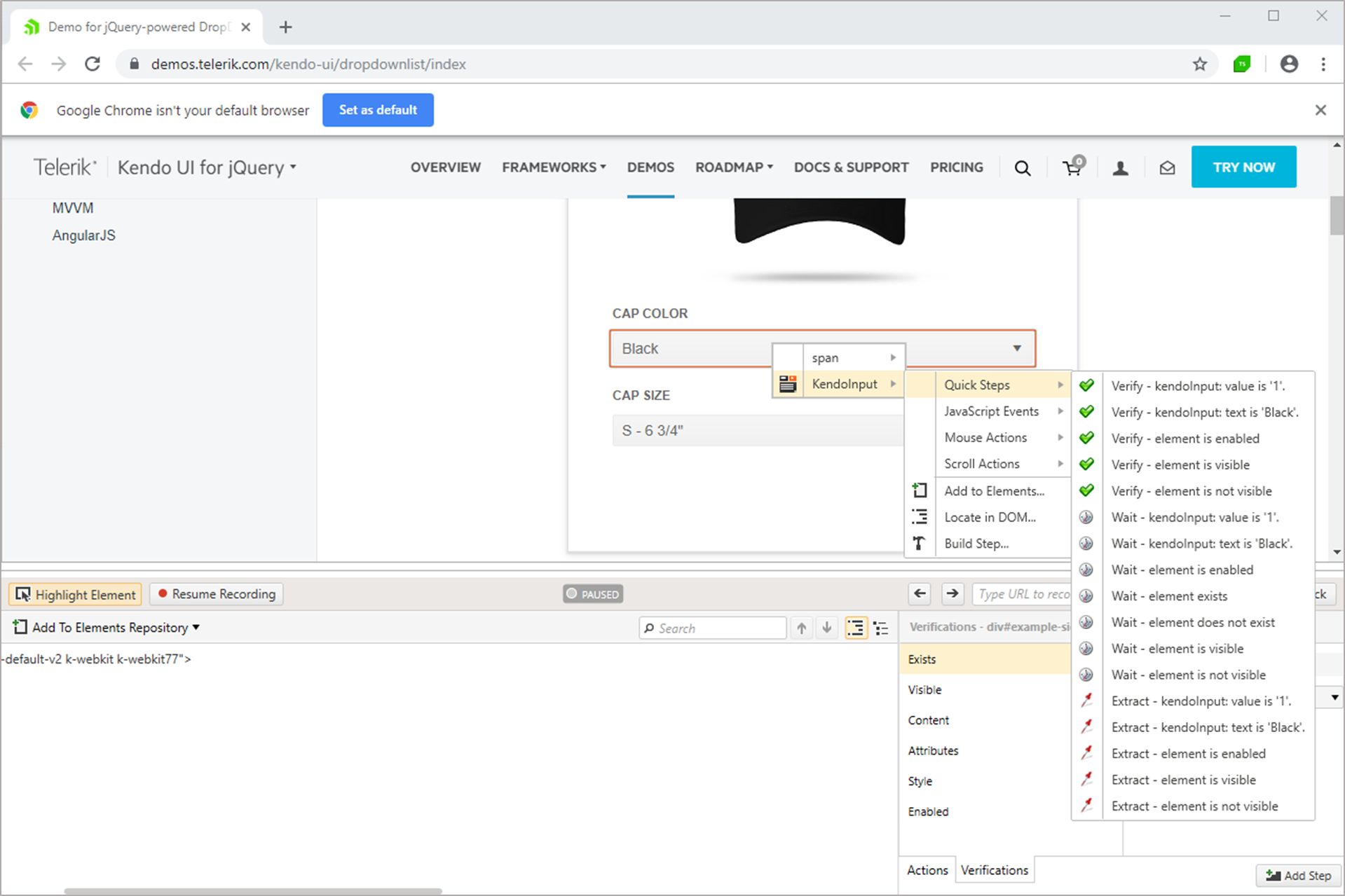 Test Studio has built-in translators for most of the Telerik controls - this is how see the span and KendoInput listed in the Elements menu. With the help of these translators, you get the KendoInput: Toggle step, when you click on the dropdown to open it. These steps, however, are not listed in the Recorder toolbar as these are generated by the actions you perform against the page.