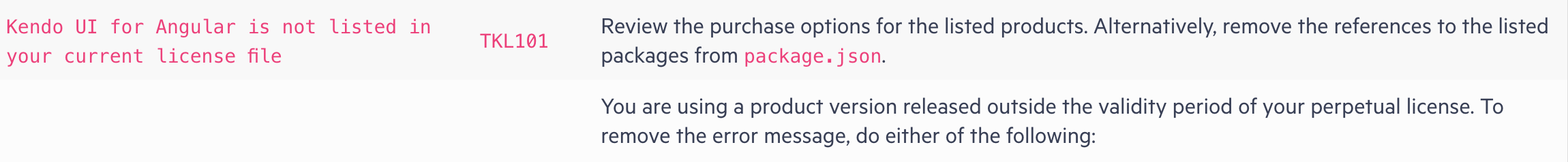 [WARN][Telerik and Kendo UI Licensing] TKL101: Kendo UI for Angular is not listed in your current license file.