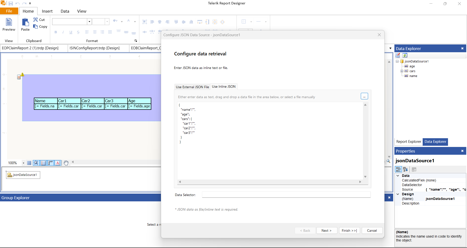 The help I need is with the stand-alone designer. If I use your JSON object through parameters method, I will be passing 14 parameters, and they will all be objects. I can create the parameters, but in the designer, there will be no fields to map to the report. How do I map a property of an object passed as a parameter to a control in the designer. I imagine the properties will be unknown to the designer and I will just have to know what they are.