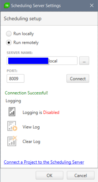 In my local Telerik installation, I can connect to the machine (See Screenshot "Scheduling Server Settings.png).
