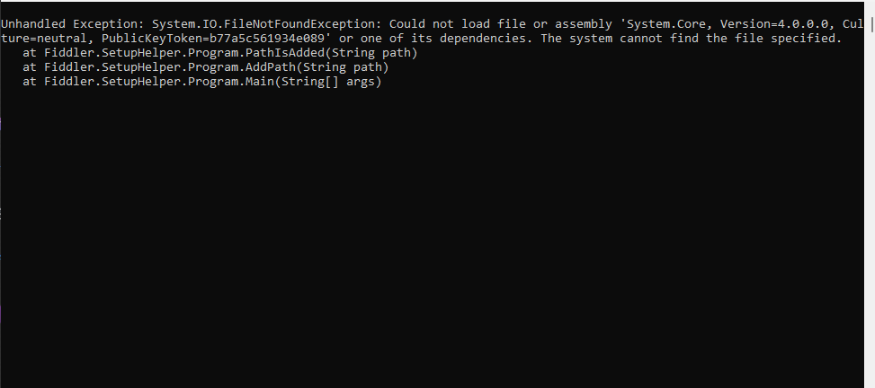 During the installation of the app I get this screen saying Unhandled Exception:System.IO.FileNotFoundException:Could not load the file or assembly system.core. I also got another error saying "Please add Fiddler classic installion directory to path environment variable". I have included the image. But the app is installed and after that when I try to launch it is not running. Nothing happens when I run the app.