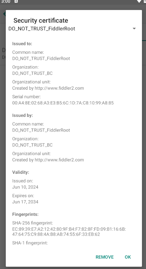 In the first scenario, you must download, install, and trust the Fiddler CA on the emulator. Once the FIddler CA is installed successfully, you can test by opening a mobile browser and a secure endpoint like https://example.com.