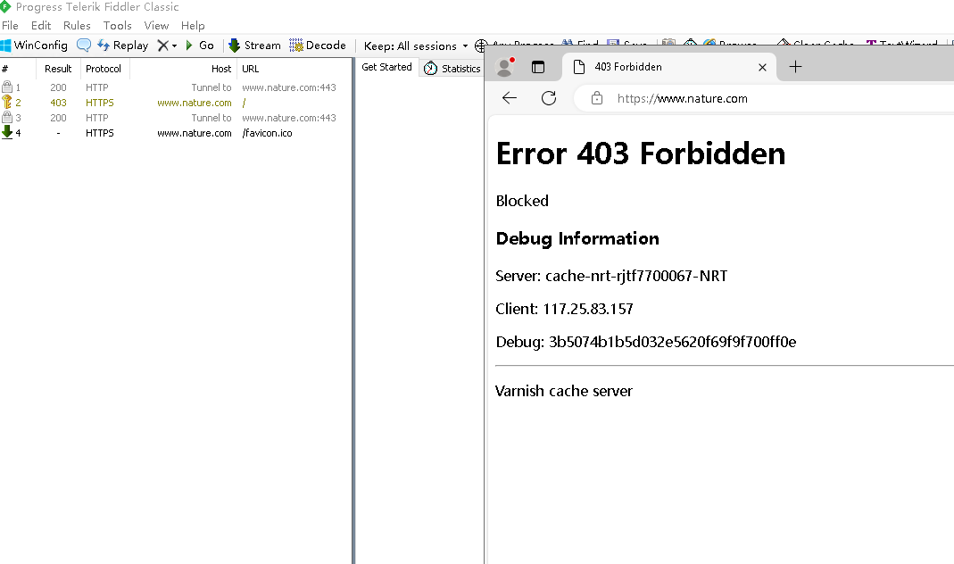 When accessing the nature website via fiddler, if you check Decrypt HTTPS traffic, error 403 forbidden will appear, unchecked resolve https can be accessed normally. As you can see in the picture below: