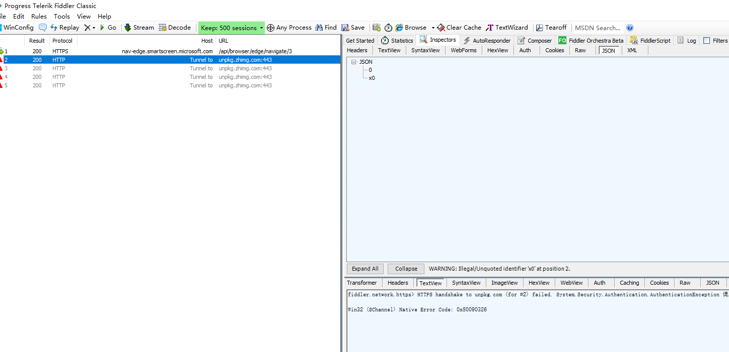 "fiddler.network.https> HTTPS handshake to unpkg.com (for #2) failed. System.Security.Authentication.AuthenticationException."