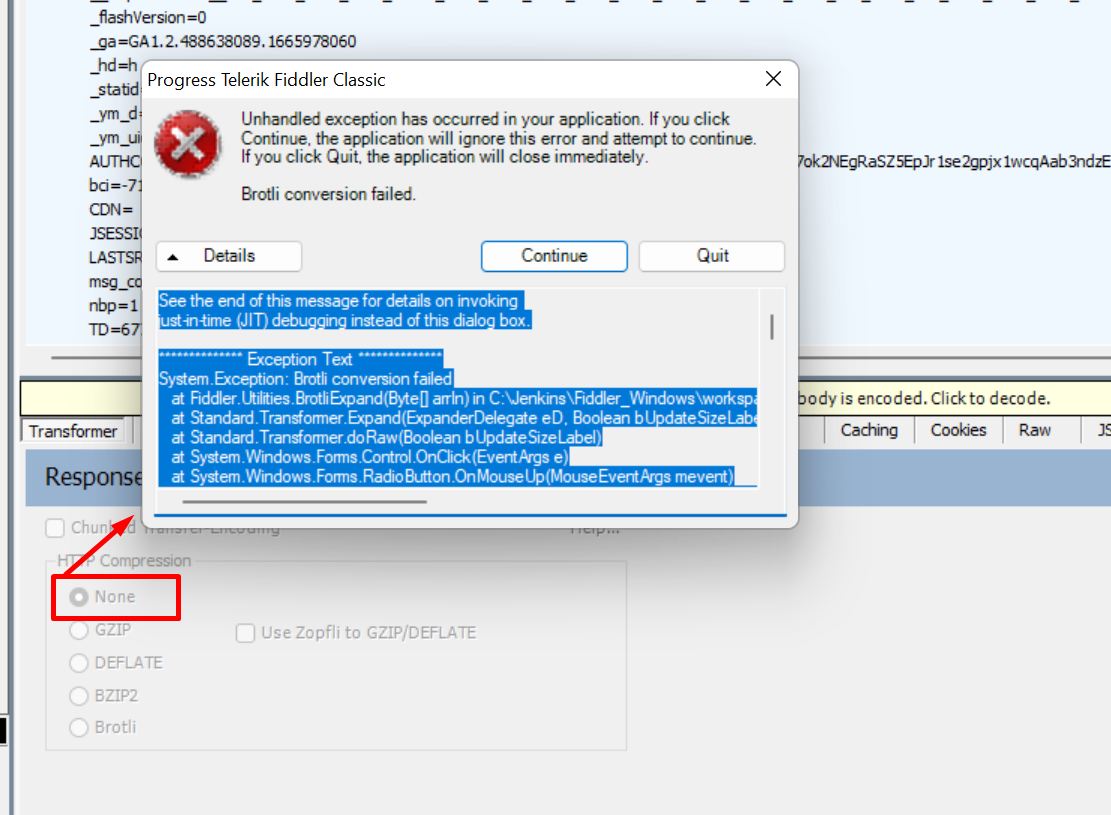 at Fiddler.Utilities.BrotliExpand(Byte[] arrIn) in C:\Jenkins\Fiddler_Windows\workspace\FiddlerCore\FiddlerCore.Shared\Common\Core\Utilities.cs:line 2796