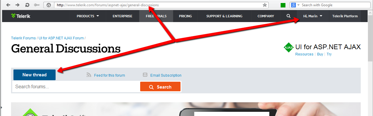The New Thread button should be on the top left of the forum. I am attaching a sample screenshot from this forum: http://www.telerik.com/forums/aspnet-ajax/general-discussions. You can also try pasting this link for the general discussions forum: http://www.telerik.com/forums/aspnet-ajax/general-discussions?newThread=/forums/aspnet-ajax/general-discussions .