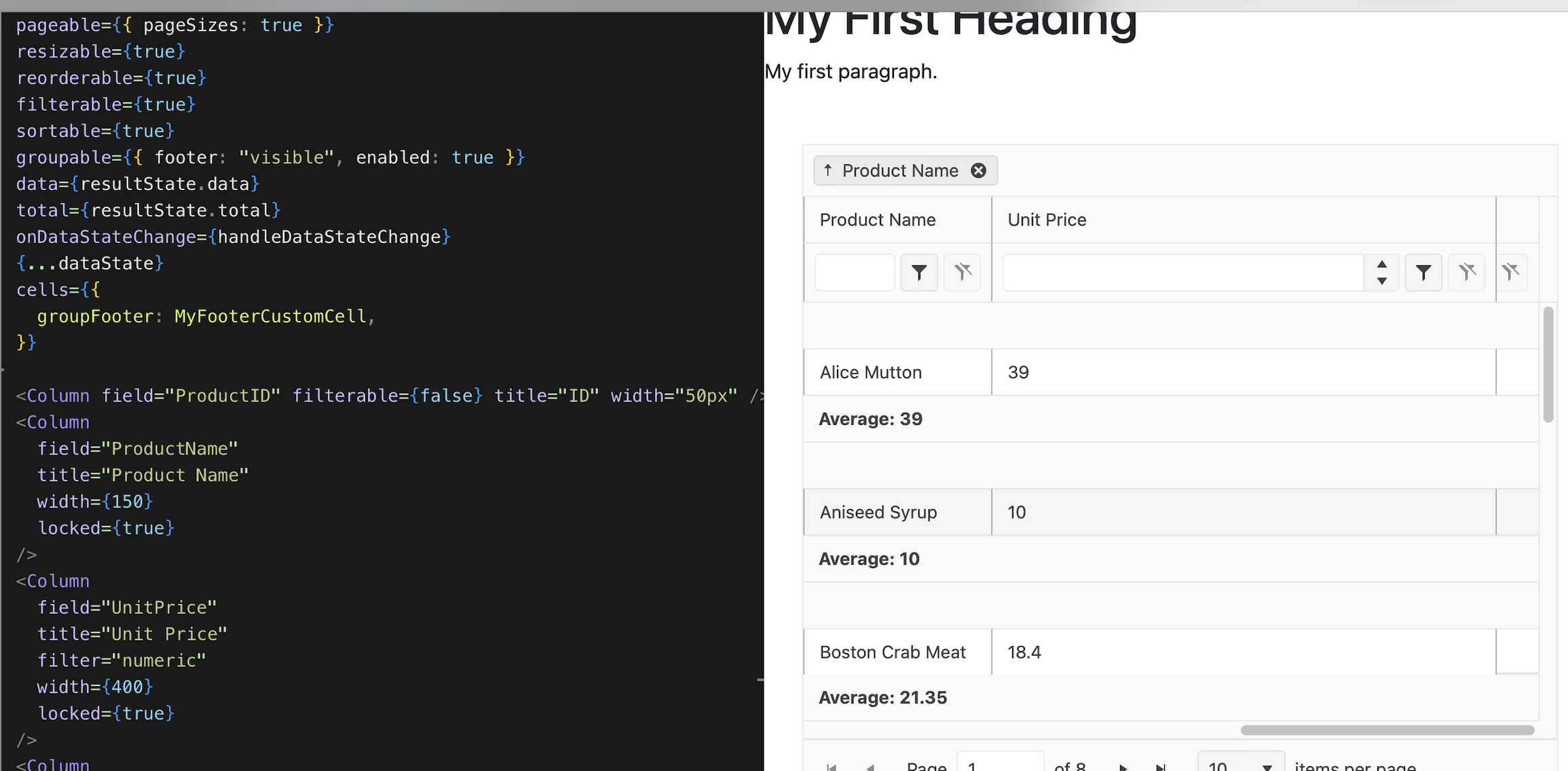 When column "Unit Price" is locked, while moving the horizontal scroll bar, the group header is sticky (expected behavior), but the group footer is not sticky (wrong behavior).