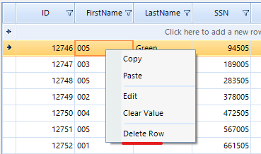 The AllowDeleteRow property is set to true by default. This property determines whether the end user can delete a row via the Delete keyboard button or using the context menu. The context menu will appear when you use the right-mouse click button over a row. Here is how it looks: