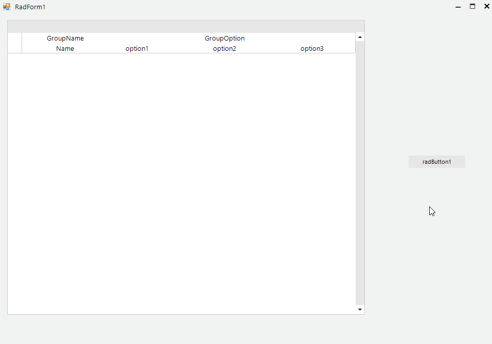 A: If I understand you correctly, you want to prevent the whole build in scrolling in grid it seems that you need to use an external scrollbar, e.g. RadVScrollbar, which will perform the scrolling behavior in the grid. You can disable the build in scrollbars by setting VerticalScrollState to ScrollState.AlwaysHide. If you need to implement your own scrolling functionality, feel free to use RadVScrollbar and manage its value, minimum, maximum according to your needs.