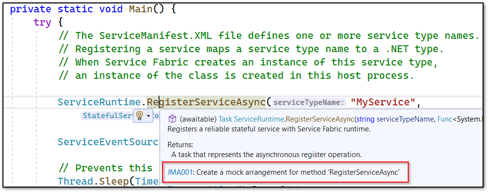 In Visual Studio 2022, the first quick action is often "Create Mock". As this is used in the overlay when hovering over a method, I see "JMA001" quite often, which is not helpful when writing non-test code.