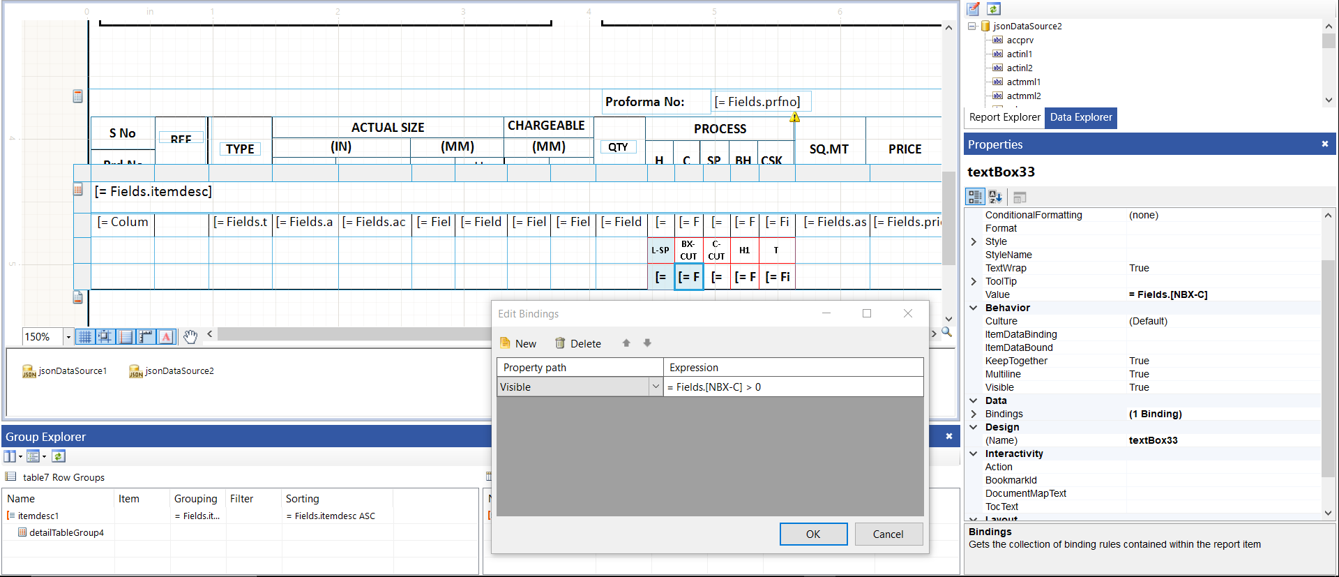 In the attached report, I see that the item textBox43 has the binding from the attached image but that is the only textbox on that row that has such a binding. You have to apply the biding for the other textbox items either individually, for example: