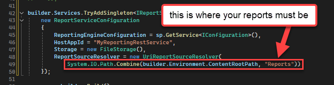 Remember that the ReportViewer is going to ask the REST service to look for a report, only by its name... but it is the responsibility or the REST service to know what folder to look in for those trdp files. You have already set this up when you configured the storage for the REST service: