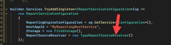 For this kind of C# Report, you need to use the TypeReportSource and not UriReportSource when setting up the REST service, because it is going to look at an assembly for a compiled type... rather than the newer XML based report (a trdp file)