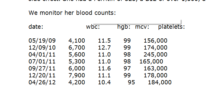 Yes, as I edit this post, I can see that the text lines up fairly well, and this is taking into consideration that in each column I am asking to have the values right aligned, which they do not do perfectly. If I were to try to do this in OncoEMR, the figures would not line up at all. I mean, they would line up fine when I enter them in the RadEditor, but when they are posted onto the note, they are all scattered. So I have to adjust, adjust, adjust over 3 or 4 minutes to get it just right.