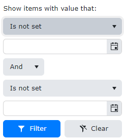 which results in the filter menu in the attached image. The problem is there is no obvious way for a user to select a single criteria. The And/Or dropdown doesn't have a "Just The Above" option. From looking at what is sent to the server side in the debugger, I found that if the user picks a second condition which requires an argument (such as equal, not equal, before, after, etc.) but doesn't provide the argument then the filter menu logic will only include the top condition. But that's not particularly intuitive to users. And given that the first condition in the list on my date columns (and hence the default) is "Is Not Set", then users would have to explicitly change the bottom condition in order to only have a single condition.