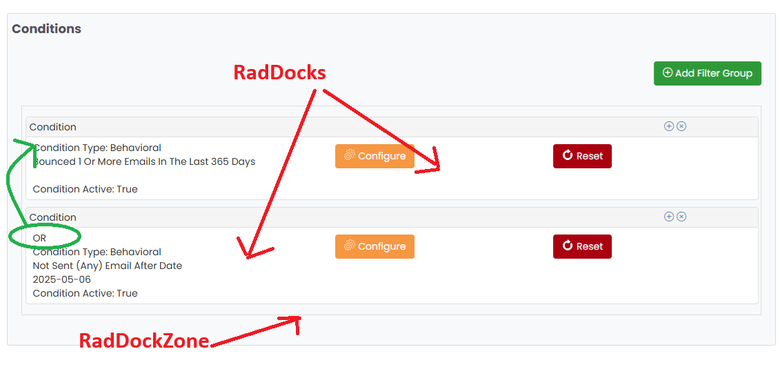 Currently it looks like this before you drag and drop: You can see the AND/OR value is not displayed next to the first condition (dock).