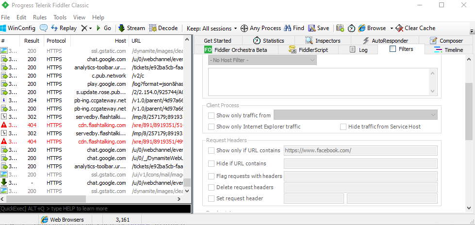 For example, if I want to capture the traffic from Facebook, I don't want to filter and have it display only URLs related to Facebook because I feel that will just show traffic for URLs like facebook.com . There are other URLs on Facebook that don't contain the word "Facebook" at all. So, I want it to retrieve and capture all the traffic from the Facebook tab.