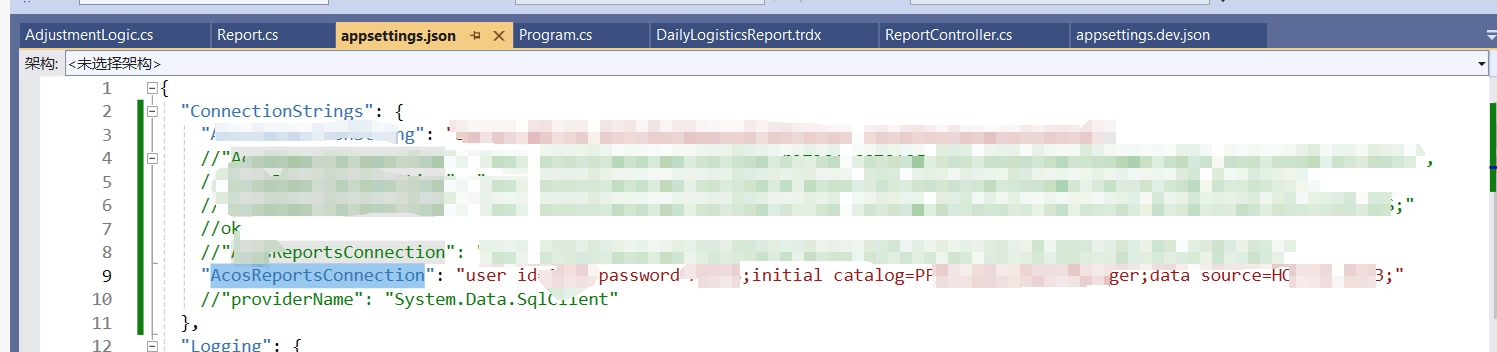 Set ConnectionString to 'AcosReportsConnection', It's OK too. Pls refer the appsettings.png.