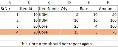 | SrNo | Itemid | ItemName | Qty | Rate | Amount |