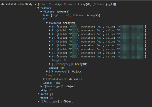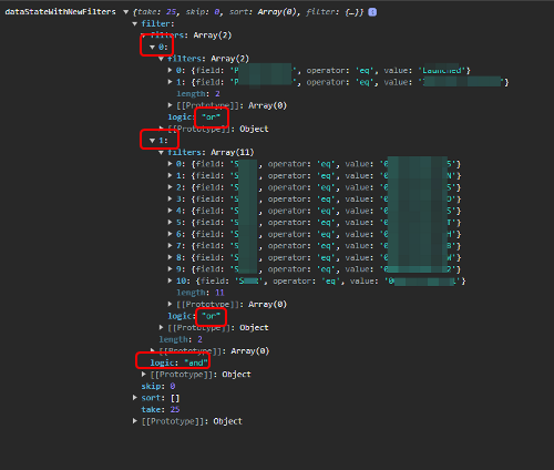 this is the DataState of the grid, which then also runs against the interface. No more changes are made here, except that the State is created with the method toDataSourceRequestString() a string. This string looks normal and the relations between the filters are resolved correctly.