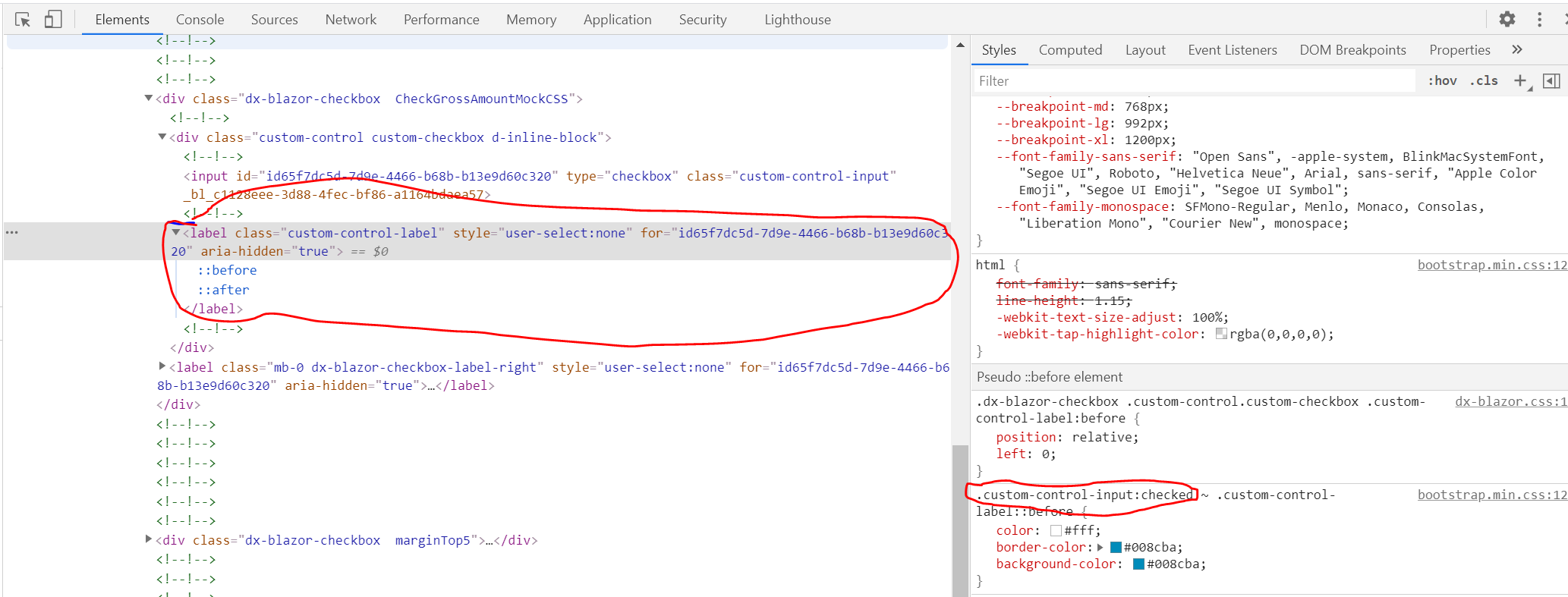 I can't find the way to examine its pseudo elements. There is no trace of .custom-control-input:checked