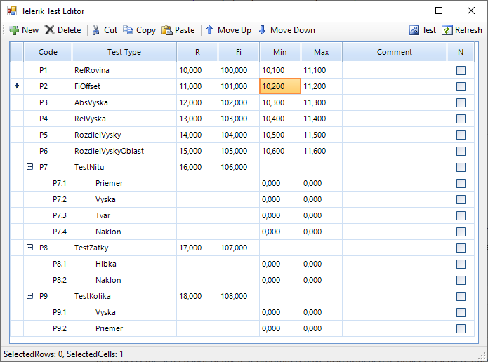 I have two types of formatting, first formatting is by FormatString property of column, R/Fi/Min/Max columns have FormatString set to {0:F3}. There is also some formatting in CellFormatting event for hiding some cells and special formatting for replacing Test Type with subitem name for subitem rows.