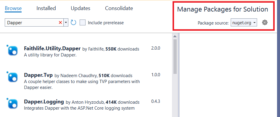 Dapper is not part of the Telerik suites. However, you can check the Package source and make sure you refer to the correct source: