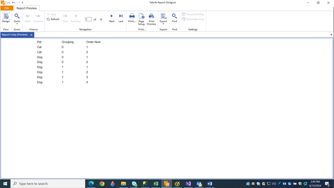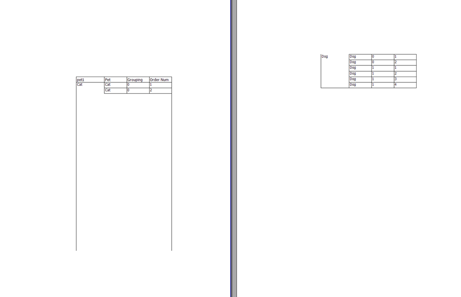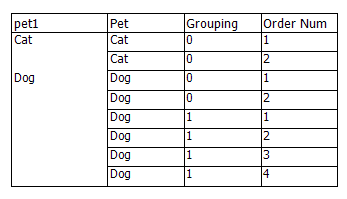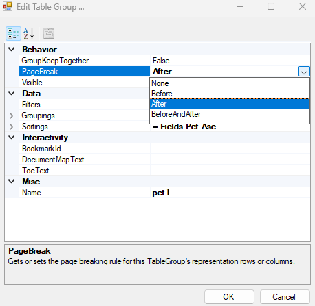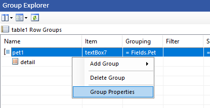 I tried making a group header for Pet, with a child of Grouping and then putting a page break at the bottom of the Grouping group but that didn’t work. I always get the result at the bottom here.