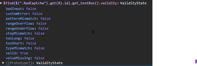 I am using a RadCaptcha control in my web page. If I don't input anything in the textbox of RadCaptcha or enter an invalid code, then after the ajax postback returns the client-side Validity object for the RadCaptcha textbox as shown below is always showing that RadCaptcha is valid when it's not. I thought the Validity object should reflect the invalid state of RadCaptcha. There is only one RadCaptcha in my web page.