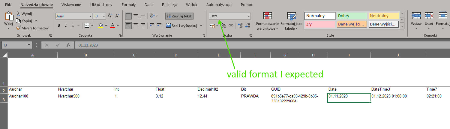Unfortunately, after exporting the report to excel (xlsx), the date type is not a date in excel (attachment invalid_format.png)