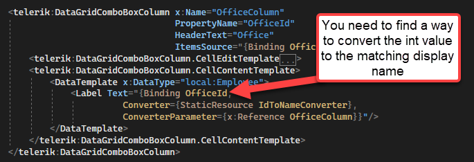 There's an important caveat to keep in mind here. You also need to customize the normal CellContentTemplate because you don't want to display the int value, but the name of the matching item in the Offices collection. You will need to write some custom logic to do this.