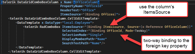 <telerik:DataGridComboBoxColumn PropertyName="Office"