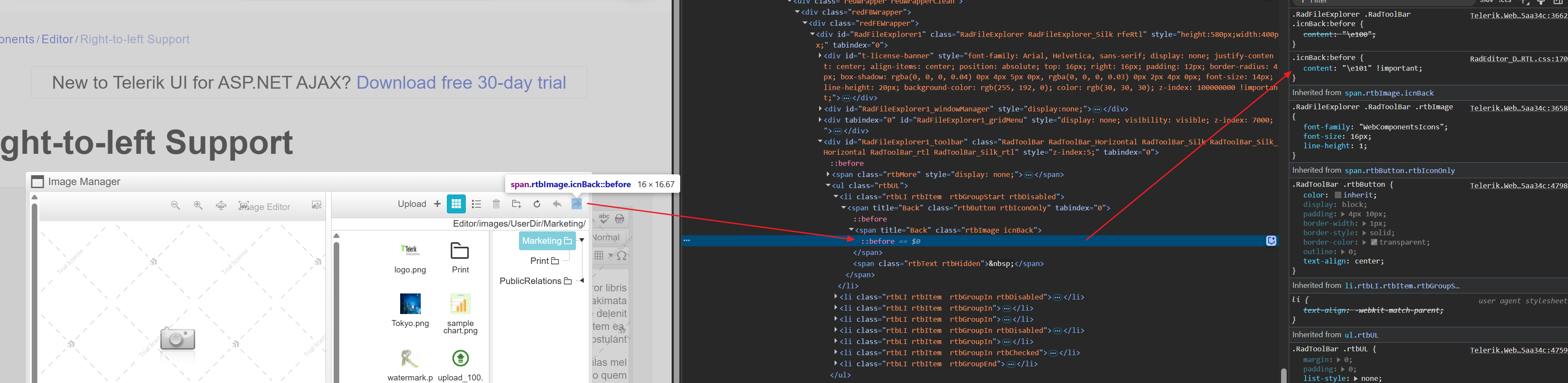 .icnForward:before { content: "\e100" !important; } .icnBack:before { content: "\e101" !important; } - Load the CSS file in RadEditor dialog through the DialogsCssFile="~/RadEditor_Dialogs_RTL.css" property. Here the path points to the RadEditor_Dialogs_RTL.css placed in the root of the web application.