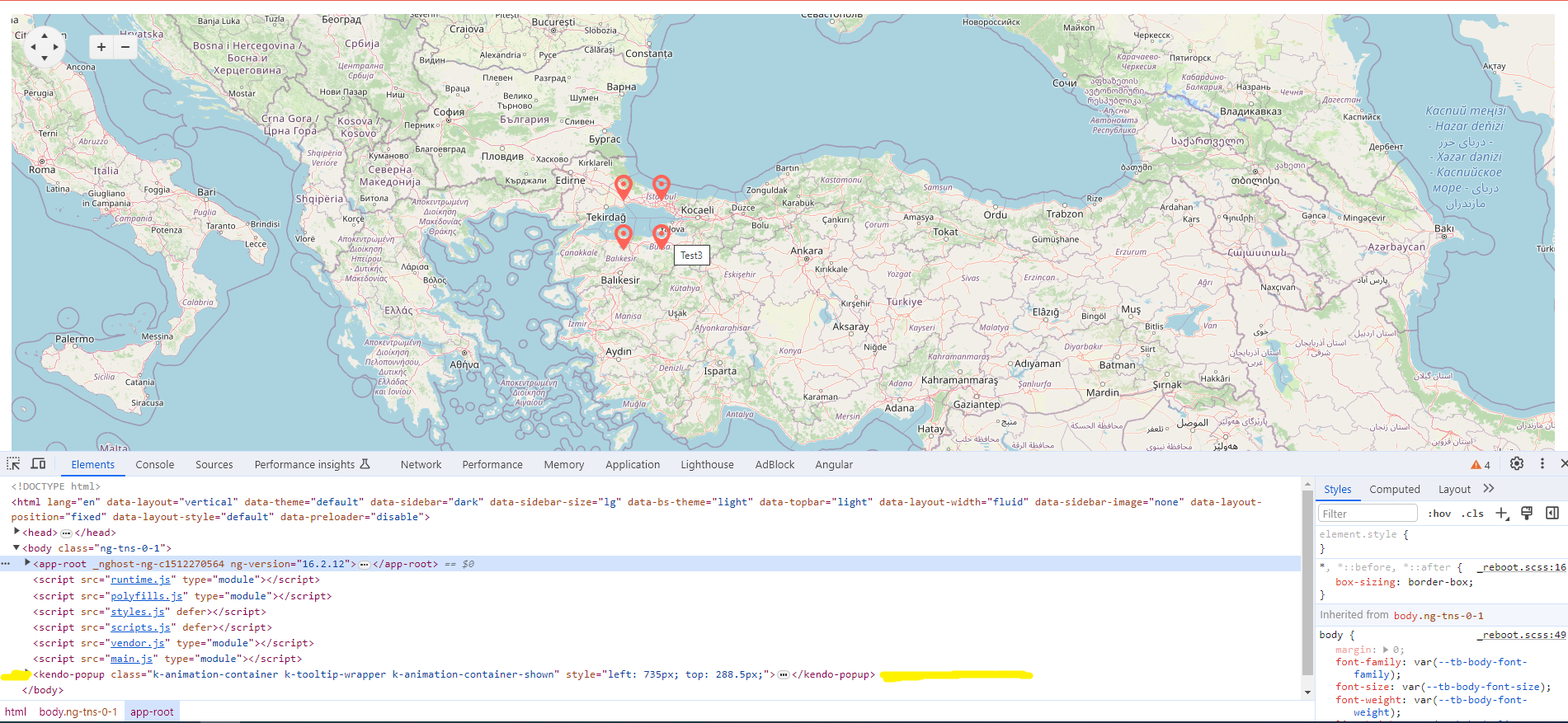 I have a map on in my window and when i open window i'm showing this map. I have also some markers with tooltip but these tooltips cannot shown on map when i inspect it i see they are under page and there is one item <kendo-popup> as i highlighted on attached image if i change element style i can see tooltip but i cannot reach that element with id or class .