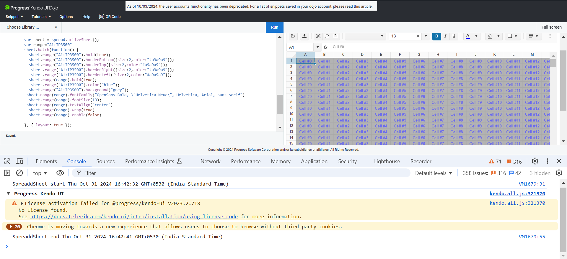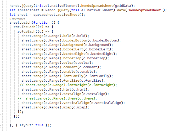 I'm using kendo spreadsheet in my project and have a lot of customization so first I'm having some code to prepare grid data and in the end using the below line to set the spread sheet data