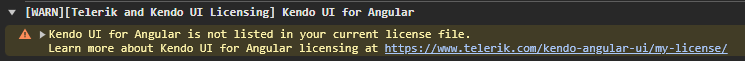 I've reviewed the cause of the error message listed at kendo-angular-ui/components/licensing/license-errors-and-warnings and have verified that I have an active license for Kendo UI for Angular, as shown below: