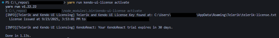 I've also followed the steps listed at kendo-angular-ui/components/licensing to ensure the license is properly downloaded and activated, with the following result: