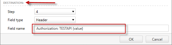 You will need to use the step, which response contains the authorization token as a source for the dynamic target. Using the different search options, define the value provided for the token. Then comes the append method in the destination section of the custom dynamic target - what you need is to enter the name of the header followed by colon (:), then the text expected from server and last the defined dynamic value from the source step set as value in curly brackets - {value}. Please, see a screenshot for reference.