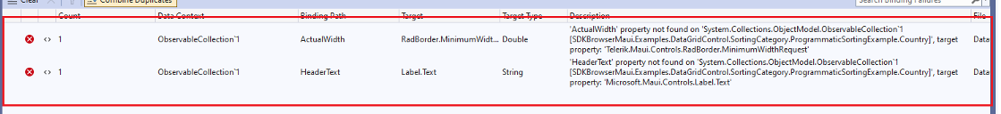 A key point is that when I added 'ActualWidth' and 'HeaderText' observable properties, the errors go away. In fact, when I run the Telerik MAUI code examples, I see the same errors in the examples "First Look" data grid example: