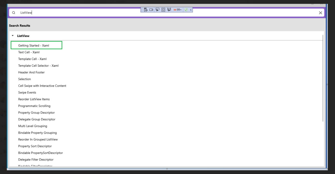 (2) Type ListView in the top Search ComboBox, and select Getting Started -Xaml