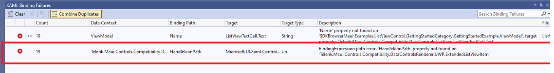 Telerik.Maui.Controls.Compatibility.DataControlsRenderer.UWP.ExtendedListViewItem HandleIconPath Microsoft.UI.Xaml.Controls.BitmapIcon.UriSource, Name='PART_ReorderHandle' Uri BindingExpression path error: 'HandleIconPath' property not found on 'Telerik.Maui.Controls.Compatibility.DataControlsRenderer.UWP.ExtendedListViewItem' FirstLookViewModel ActualWidth RadBorder.MinimumWidthRequest Double 'ActualWidth' property not found on 'QSF.Examples.DataGridControl.FirstLookExample.FirstLookViewModel', target property: 'Telerik.Maui.Controls.RadBorder.MinimumWidthRequest' FirstLookViewModel HeaderText Label.Text String 'HeaderText' property not found on 'QSF.Examples.DataGridControl.FirstLookExample.FirstLookViewModel', target property: 'Microsoft.Maui.Controls.Label.Text'