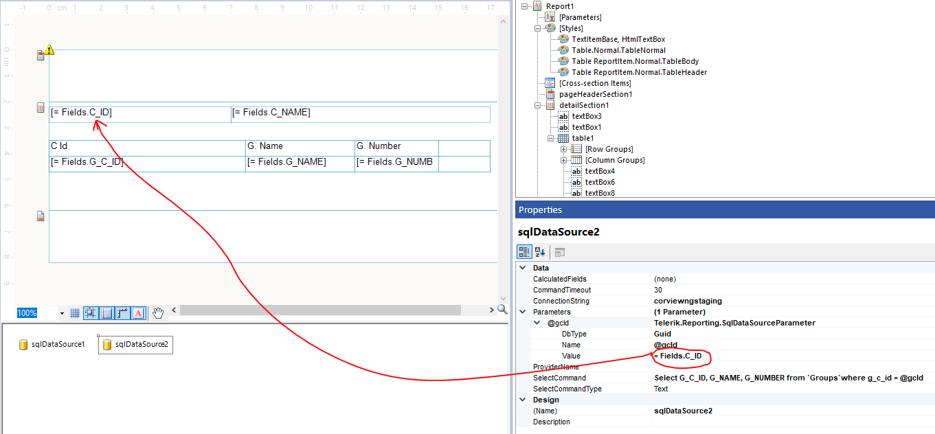 The report dataSource is SqlDataSourceMain and Table DataSource is sqlDataSourceDetail