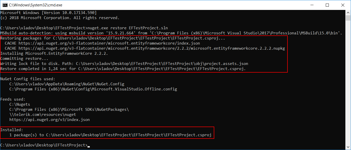 When I have problems with some NuGet packages that are not restored by building the solution in VS I always try to restore them with nuget.exe calling it from a command line. To do so you will need to download the latest stable version of nuget.exe from here and perform the "nuget.exe restore EFTestProject.sln". This command will be valid if the nuget.exe is located where the EFTestProject.sln is and the console active directory is moved at the same location. Attached you can find the result of the command.