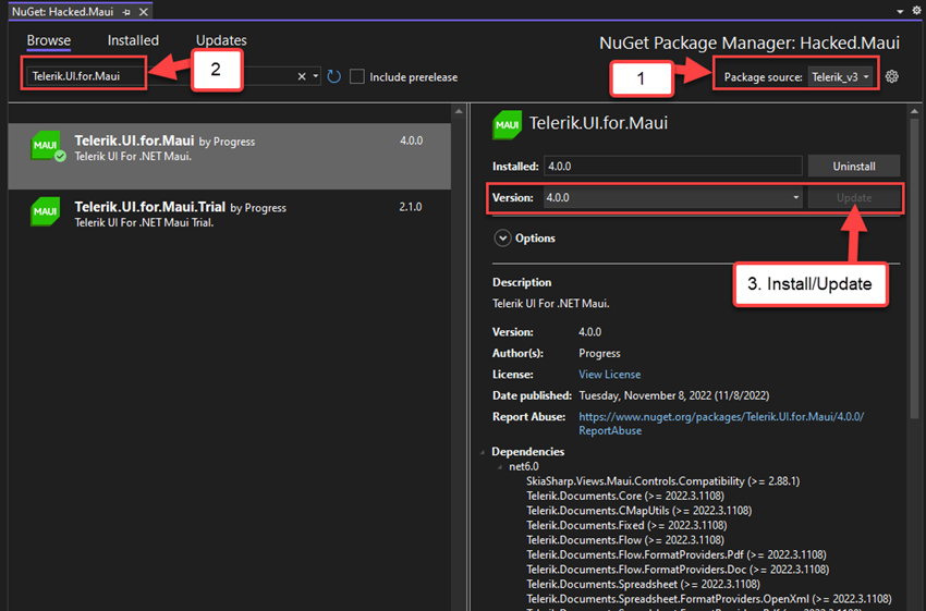 3. Select the Telerik server for the package source (or the "All" source) and search for "Telerik.UI.for.Maui" and install it
