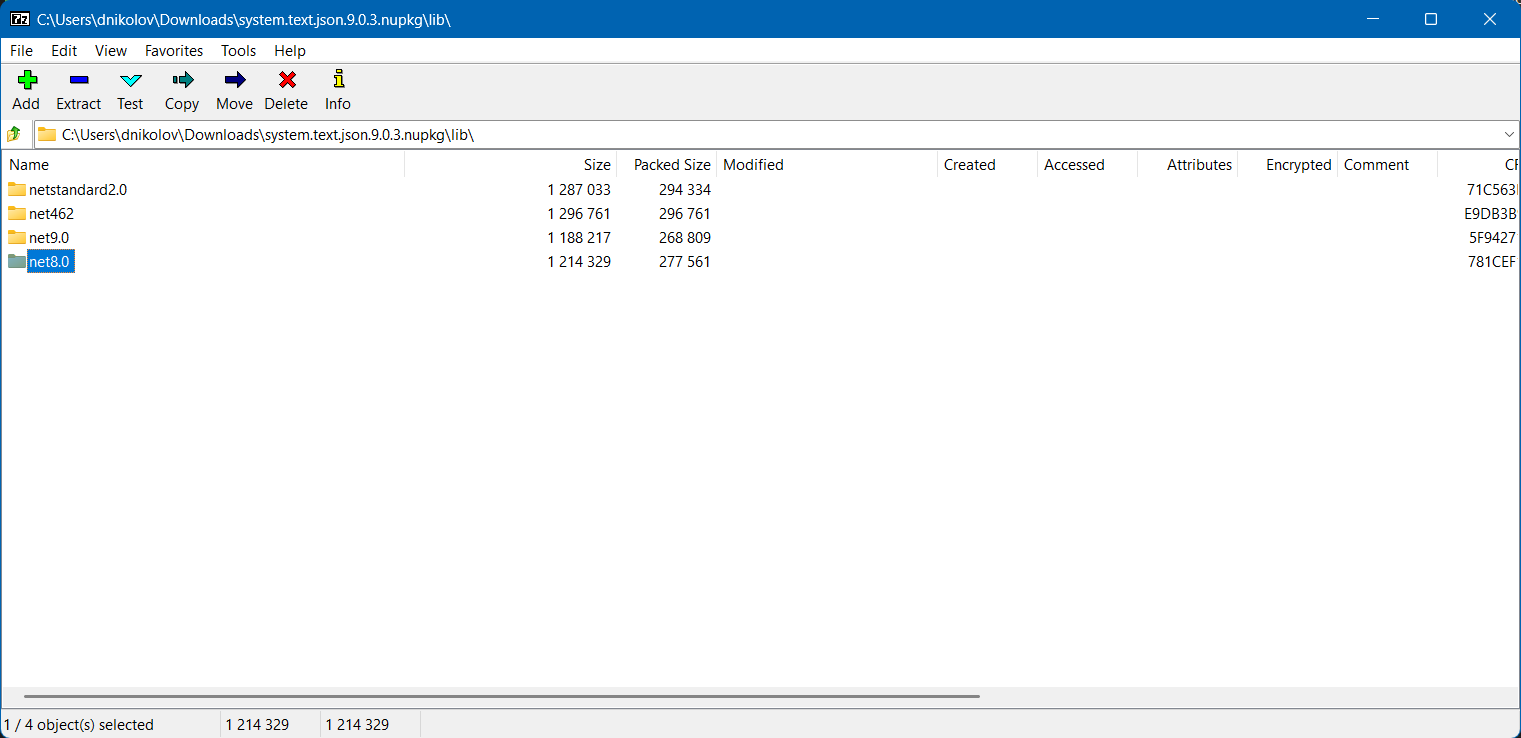 For example, you can download the System.Text.Json package and open the archive with a file archiver application. If you navigate to the lib directory, you can see that the assembly is still built for .NET 8, .NET 9, .NET Framework 4.6.2, and .NET Standard 2.0