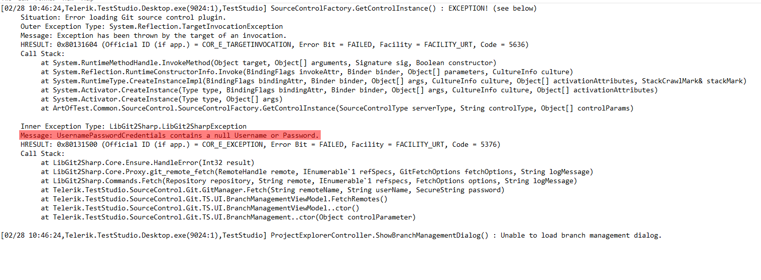 However, there are some additional details on your end to be able to better understand what might be going wrong. What I understood so far is that you are unable to manage the Git repo branches when trying to do this in Test Studio. Upon reviewing the log file, you noticed the error for the missing username and password.